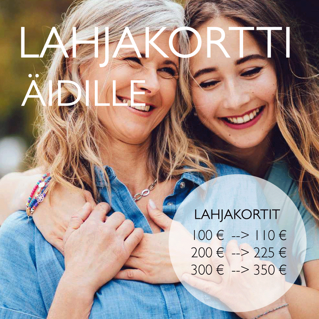 100 € lahjakortin arvo 110 €, 200 € lahjakortin arvo 225 € ja 300 € lahjakortin arvo 350 €